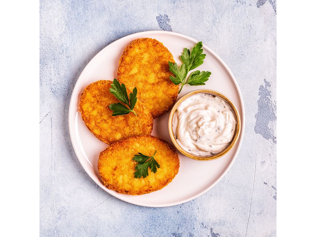 Two hearty pork sausage patties served with golden chopped hash browns, fluffy scrambled eggs, a hint of cinnamon, and drizzled with pure New Hampshire maple syrup.